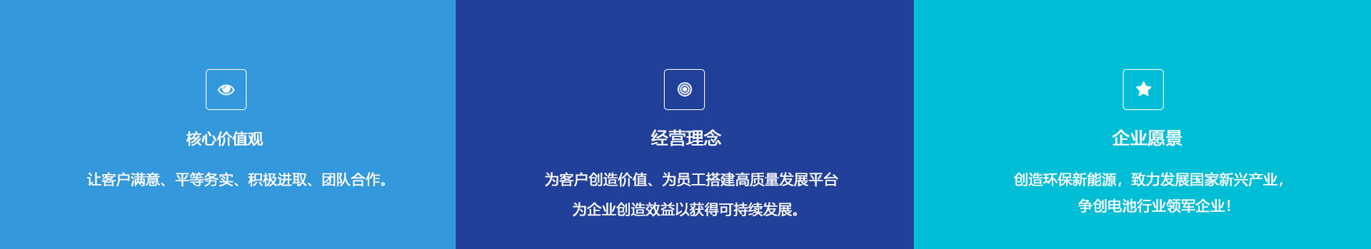企業(yè)愿景:創(chuàng)造環(huán)保新能源,致力發(fā)展國家新興產(chǎn)業(yè),爭創(chuàng)世界電池行業(yè)領(lǐng)軍企業(yè)!